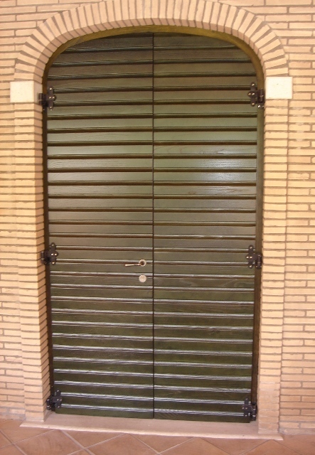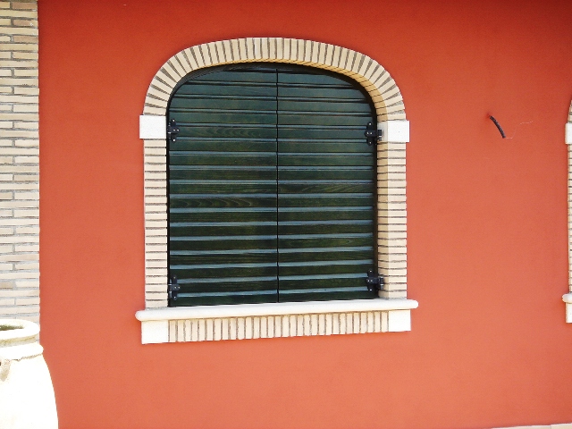 Sportelloni centinati con doghe orizzontali in legno di castagno tinto verde bosco