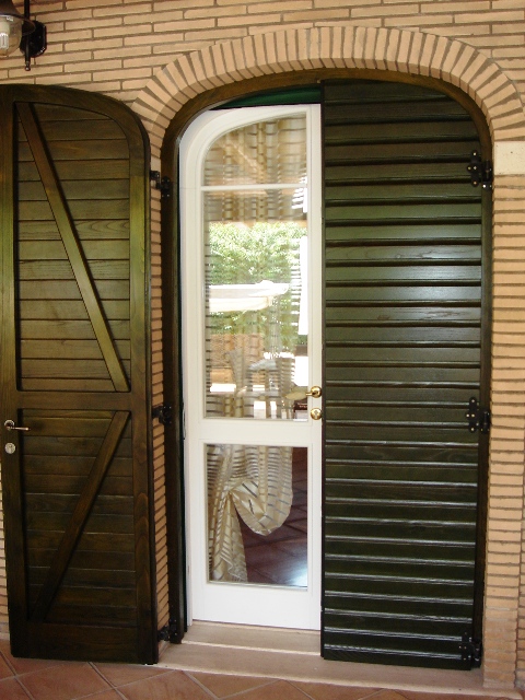 Sportellone per portafinestra centinati in legno di castagno e finestra laccata bianca