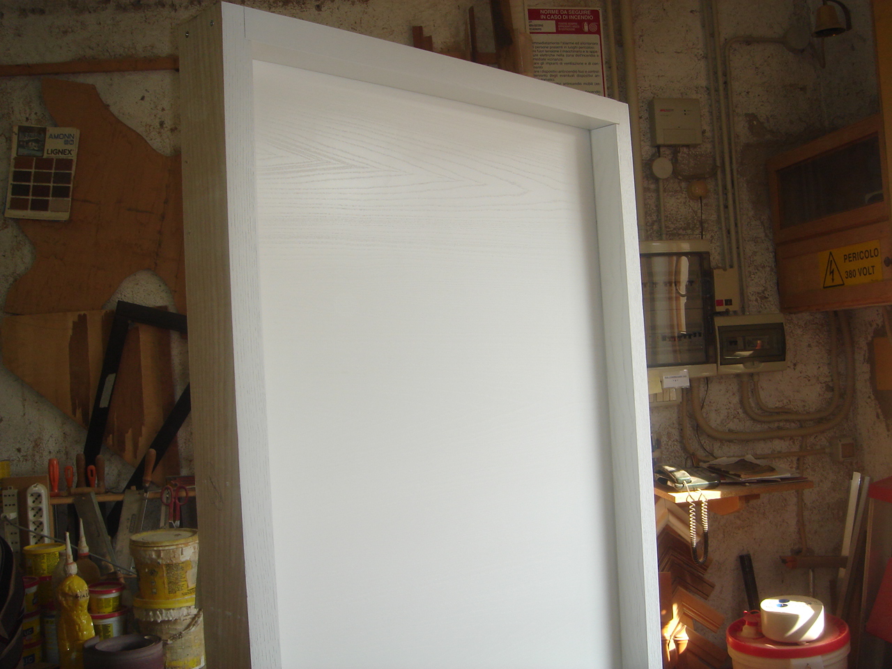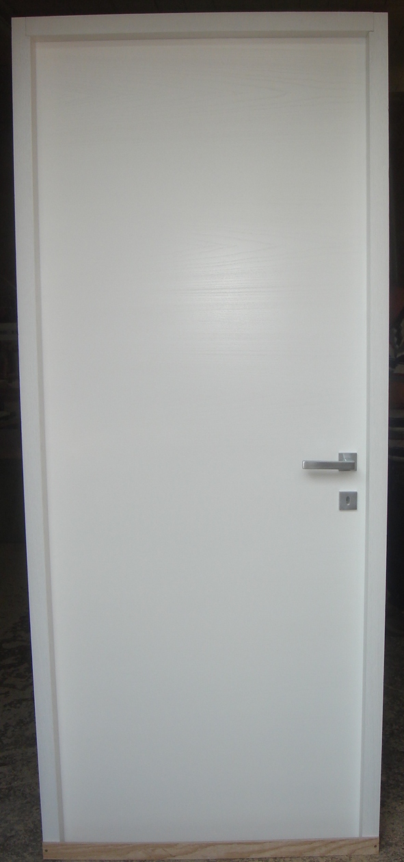 Porta in frassino laccatura bianca opaca poro aperto, 1anta battente, anta tamburata, completa di telaio e mostrine in legno massello.