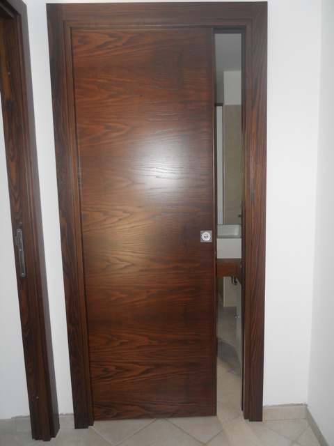 Porta scorrevole in frassino trasversale, tamburata, con telaio e mostrine in massello di frassino.