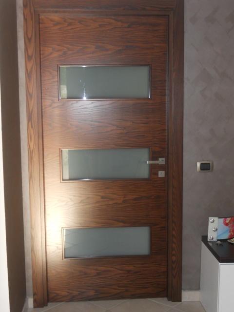 Porta tamburata in frassino trasversale, con telaio e mostrine in massello di frassino, con tre vetri visarm33