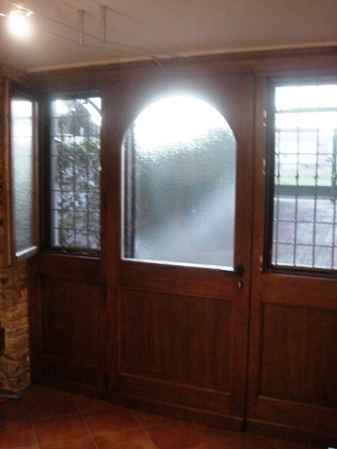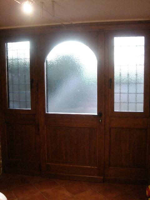 Vetrata in legno di castagno tinto con bugna inferiore, composta da portone d'ingresso centrale con vetro ad arco e due ante laterali quadre apri