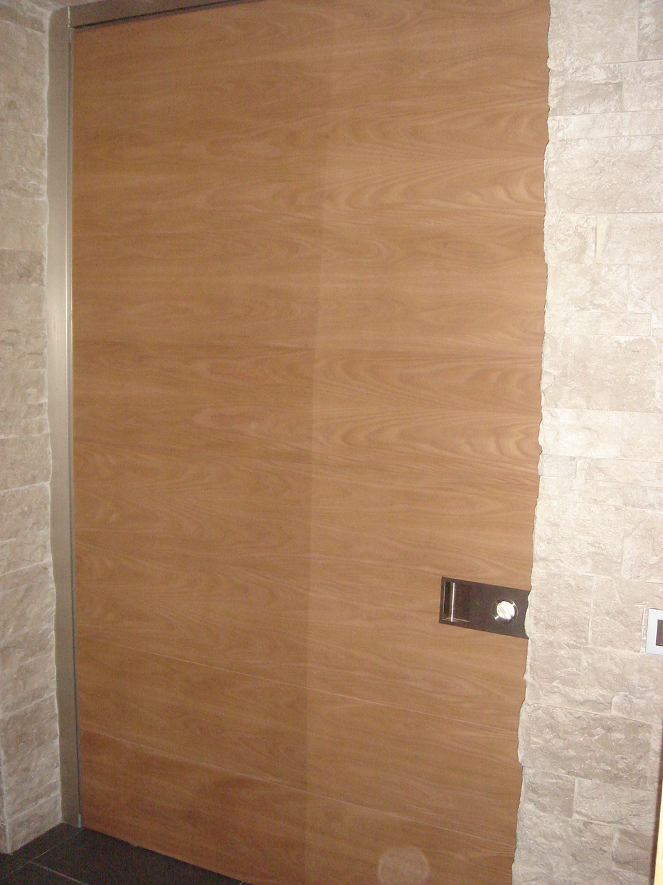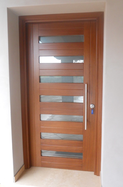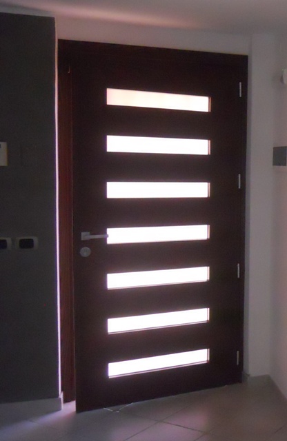Portone 1anta in massello di iroko (parte esterna) e frassino parte interna, con vetri blindati.