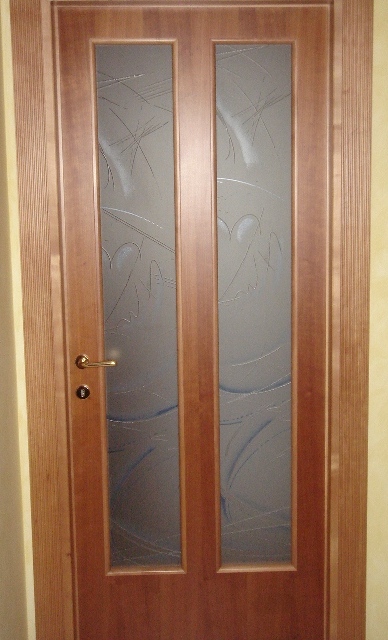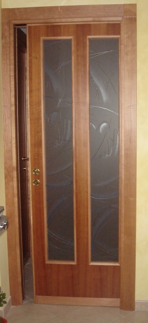 Porta tamburata 1 anta battente in ciliegio tinto, con doppi vetri verticali lavorati