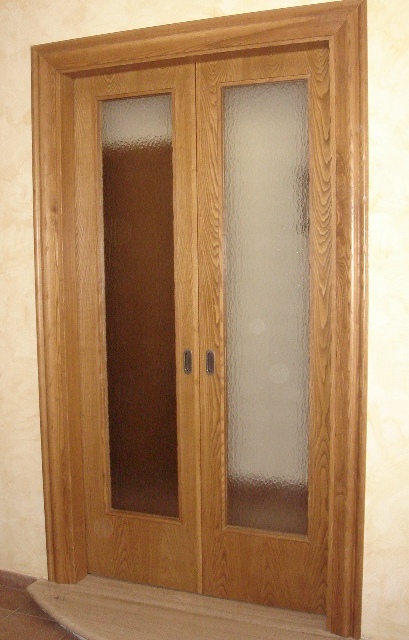 Porta tamburata scorrevole 2 ante in castagno anticato con vetri.