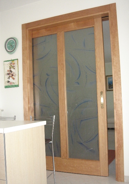 Porta 1 anta scorrevole in ciliegio massello con vetri lavorati